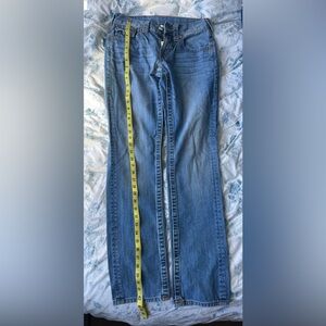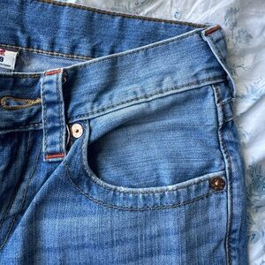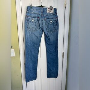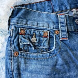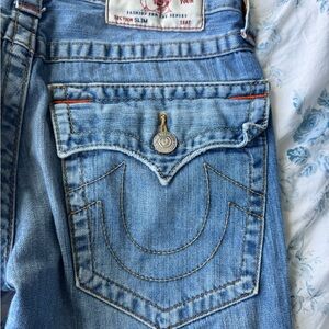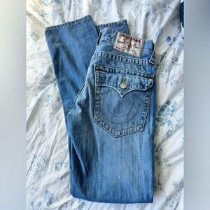 Chic jeans by True Religion. Sky blue denim with iconic stitching. Perfect for everyday style.