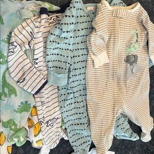 Everything you could need for a new baby boy! Cotton Newborn 0-3 Month Baby Boy Clothes Lot all pieces are 100% cotton, some pieces are organic, no polyester. Brands include Carter’s, Gerber, rabbit bear, Gymboree and more. Most our footed, sleeper pajamas, some pants and onesies included. A church outfit for Easter, white collar shirt, onesie with bunnies on it and green khaki pants. Sizes are all either newborn or 0 to 3 months.