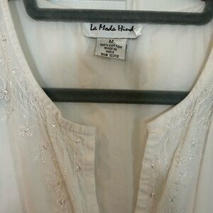 This elegant white 100% cotton maxi dress is perfect for any occasion. Its light flowing design offers both comfort and style. It is beaded from top Robin Hood collar to bottom hem. Has side slits and a waist tie in the back. Measures 17” waist and 39 1/2” from top collar to bottom hem. Nonsmoking home.