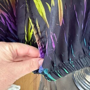 Vintage 90s surf style lightweight satin windbreaker, quarter zip pullover with all over abstract slash print in purple, green, yellow, blue, brown on black with the surf style logo patch at the chest. Elastic waist and wrist. On seam hip pockets. Tag size one size fits most. Laying flat measures 26.5 inches shoulder to hem and 28.5 inches armpit to armpit.