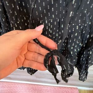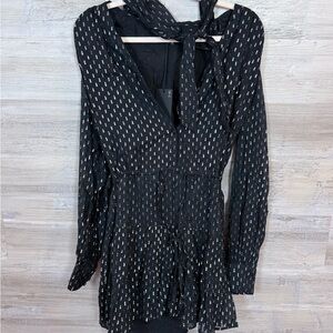 Elevate your next event with this stunning PAIGE mini dress. This piece features a sophisticated black base with shimmering silver metallic thread details throughout. The feminine silhouette includes a flattering V-neckline with a tie-neck detail and an elasticized waist for a perfect fit.