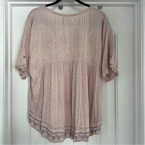 Knox Rose XXL blush floral embroidered boho peasant top with high low hem. Features short sleeves and a flowy fit.