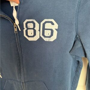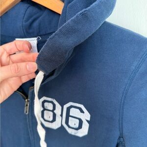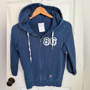 Cozy blue hoodie with front zipper. Features '86' and 'PINK' logo details.