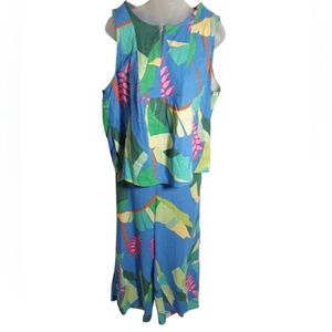 Brighten your wardrobe with this vibrant tropical print 2-piece set! The sleeveless top features a relaxed fit with a metal hook front closure, paired perfectly with matching wide-leg pull-on pants. Lightweight and breezy, this set is ideal for vacations, resort wear, or summer days out. The bold mix of blue, green, and pink tropical leaves gives an eye-catching, island-inspired vibe.