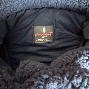 Navy fleece and nylon oversized vest with snap front and cute bows on the sides. I wore it a couple times. It’s in great condition