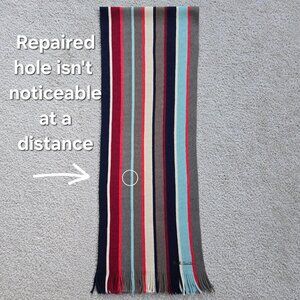 Love these stripes in 100% wool from Paul Smith. Please note the start of a tiny hole, which I have treated with a fray block product. That is a special fabric adhesive designed to prevent holes from expanding or yarn from fraying. There was also a spot along the side edge that looked like it might start unraveling, so I treated that spot, too. Neither of these are very noticeable--check pics to see for yourself.