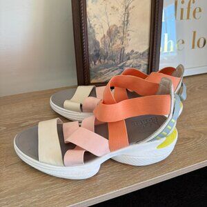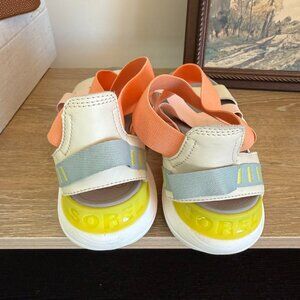Love the color of these light pink to coral Sorel sandals. Crisscross detail and sporty style give Sorel's Explorer Blitz Multi-Strap sandals a standout look. They are crafted with leather and elastic straps, a cushioned midsole and a grippy outsole. Gently worn & in excellent condtion. Size 8.