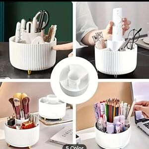 Keep your cosmetics neatly organized with this rotating white makeup organizer. Perfect for easy access and stylish storage.