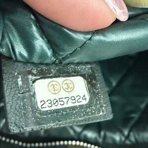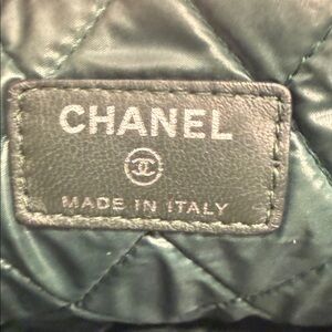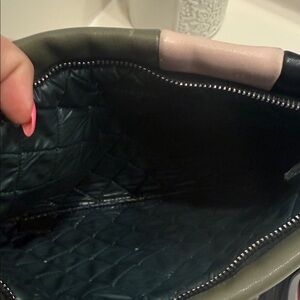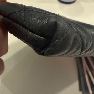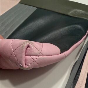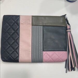 Elegant CHANEL clutch with quilted design. Features pink, olive, and black leather. Includes tassel detail. COMES WITH COA
