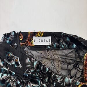 Lioness sheer velvet burnout paisley pants in a dramatic wide-leg silhouette, featuring a semi-sheer mesh base with rich flocked velvet detailing in warm gold, rust, teal, and charcoal tones for a true Whimsigoth / Y2K revival look. Lightweight and flowy with a flattering high-rise fit, these statement pants are perfect for layering, festivals, or elevated evening styling—please review photos for additional details about the condition of the garment.