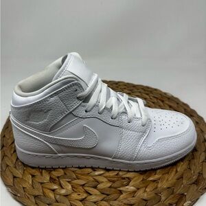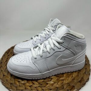 NIKE Air Jordan 1 Mid Sneakers Triple White Leather Size 7 Youth, 8.5 Women's