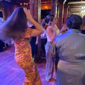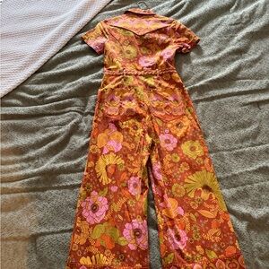 Bright floral design with a mix of orange, pink, and yellow. Short sleeves and wide legs for a retro vibe. Worn once. Tons of compliments on it. Bought for 300.