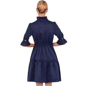 Elegant navy blue dress with a ruffled neckline. Features a tiered skirt and three-quarter sleeves. Perfect for any occasion.