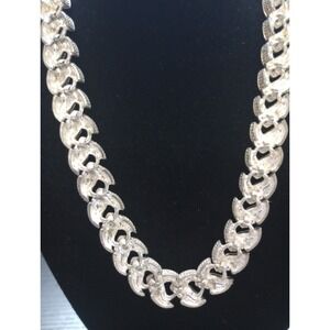 Striking vintage mid-century silver-tone necklace featuring bold articulated textured leaf / chevron links. This is a substantial, well-made piece, weighing an impressive 106 grams, with solid cast links that lay beautifully around the neckline.