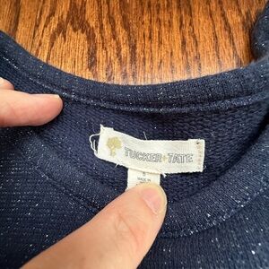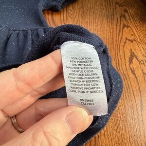 VGUC navy blue short sleeve dress. Polluted sleeves. Functional patch pockets on front that are in the shape of hearts. Shimmery silver thread spun throughout. Great party dress! Heavier sweatshirt-esque material.