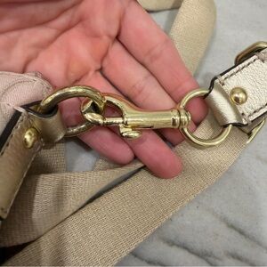 Elegant Coach crossbody in blush pink. Features signature pattern and gold-tone hardware. Ideal for daily wear.