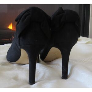 Stunning and elegant! These sophisticated pumps exude quiet luxury! Slip on black suede pumps with an chic black bow at the back of the heel. Cushioned foot-bed. Approx heel height 3.75". Very gently worn with only sign of wear being on the soles.