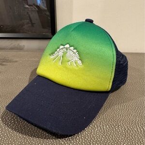 Stylish trucker hat with a dinosaur design. Features a gradient of green and yellow on the front. Black mesh back for breathability.