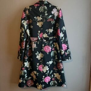 Chic long sleeve coat with floral design. Features pink and gold flowers on a black background. Stylish and elegant. Condition is pristine. NWT