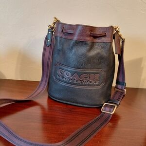 Coach Field Bucket Bag in colorblock leather with a prominent badge logo, featuring a black main body with burgundy/purple accents and a striped crossbody strap. Comes with Dust Bag.