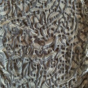 This piece showcases a muted grey-blue base with repeating "Save the Queen" script, delicate bird imagery, and an ornate turquoise baroque-style motif at the front.