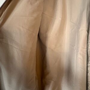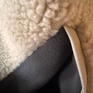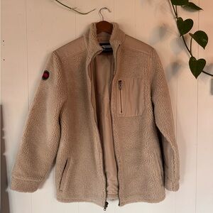Warm tan sherpa fleece jacket. Features zippered pockets. Ideal for cold weather.