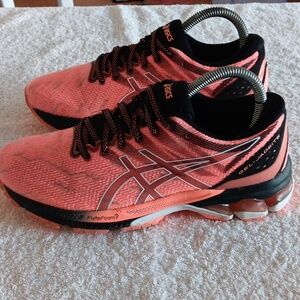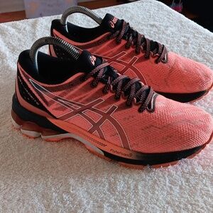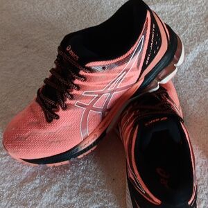 In great condition and gently worn, Asics Gel Jadeite running shoes in size 7, Salmon/black/white colorway, breathable mesh uppers, lightweight design, decorative stitching, FlyteFoam midsole, Duomax comfort soles, removable comfort insoles, Asics logo on sides and tongue.