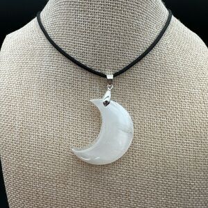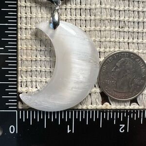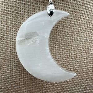 selenite, moon pendant, celestial jewelry, gemstone necklace, boho style, moon phase, spiritual jewelry, celestial accessory, silver accents, bohemian jewelry