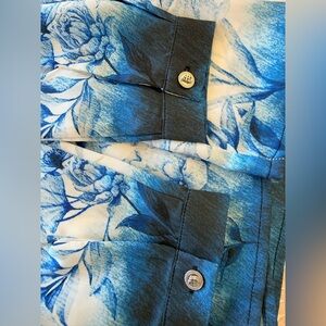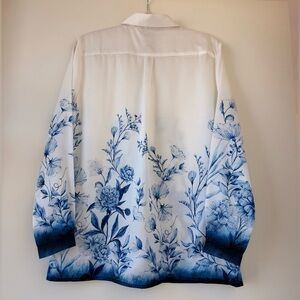 Elegant blouse with floral design. Features classic collar and long sleeves. Pit to Pit 20in. Length 28in