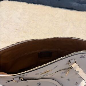 Chic Coach tote with floral design. Cream color enhances elegance. Ideal for everyday use.