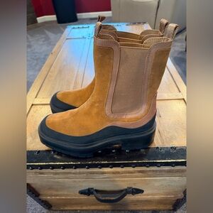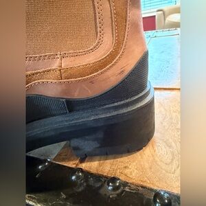Stylish and durable tan genuine suede Chelsea boots perfect for any occasion. These boots offer comfort and a sleek design. Black rubber soles, easy pull on style. We just a couple of times, small scuff at inner heel on one boot as shown in photos. Size 10.