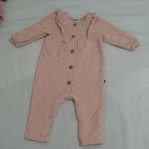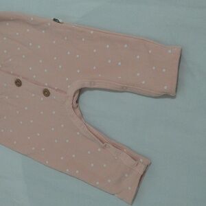 Adorable light tan baby girl romper with white polka dots. Features front button closure.