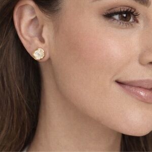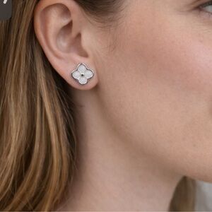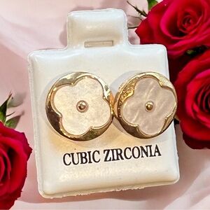 These are sparkling cubic zirconia stud earrings with mother of pearl/enamel center... a monogram flower or clover design. Includes silver or gold finish. Very classy and elegant!