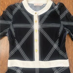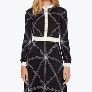 This elegant black and white Tory Burch dress geometric dress offers a sophisticated look. Stunning classic style, with a pattern that works in the office and beyond.