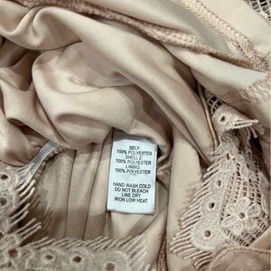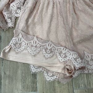 Chic long sleeve short jumper in a soft blush pink. Features delicate lace trim and a flattering waistline. Eyelet closure in back.