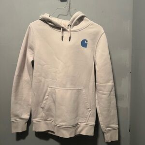 Cozy off-white hoodie featuring Carhartt logo. Includes front pocket and drawstring hood.