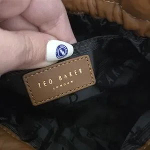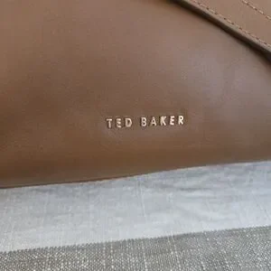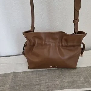 Chic Ted Baker crossbody in tan leather. Features a stylish ruched design. Ideal for versatile wear.
