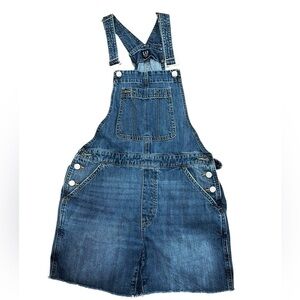 Casual and versatile GAP denim overalls in a medium wash. Features adjustable straps, a front bib pocket, side button closures, and relaxed shorts-length bottom. Made from sturdy yet comfortable denim, perfect for layering over tees, tanks, or sweaters. Women’s size small.