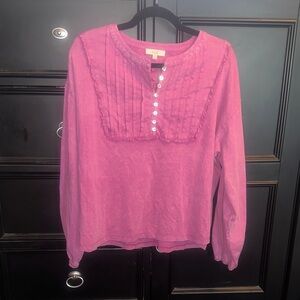 Elegant fuchsia blouse featuring pleated front. Button detail adds charm. Perfect for any occasion.