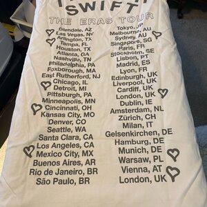 Official Taylor Swift The Eras Tour off-white oversized distressed t-shirt. NWOT — appears unworn, no stains, holes, or marks. Front features a large grayscale graphic of Taylor in a sparkly ball gown with stars and “Taylor Swift The Eras Tour” text. Back has the full 2023–2024 international tour dates with heart designs. Intentionally distressed detailing on collar, hem, and sleeves — this is a factory design feature. Size Medium. 100% cotton. Made in Mexico. RN# 102050. Smoke-free home.