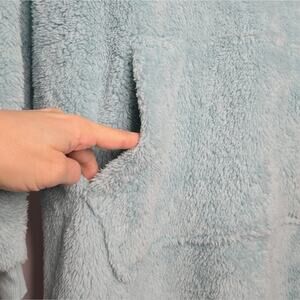 Super soft and cozy hooded fleece robe in a light seafoam greencolor. Features a front pocket, drawstring hood, and slight high/low side slits.