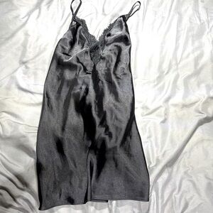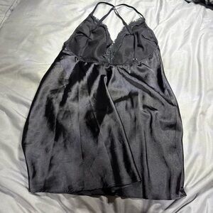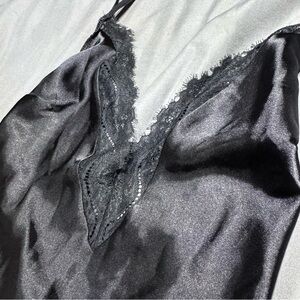 Elegant black satin chemise with delicate lace trim. Features adjustable straps for a perfect fit. Luxurious and comfortable.