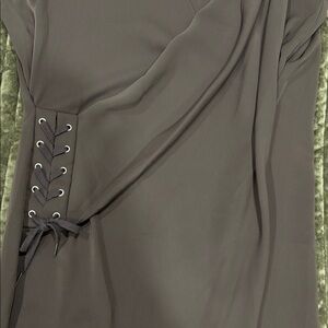 This is a really unique piece can be worn as a dress or longer top. The draping in the front and side lace up give it a fun edgy look. I’m curvier so on me it’s tighter on the bottom and looser on top.