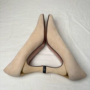 Gorgeous luxury heels made in Italy by St. John. Cream suede with soft gold accent on back of heels.