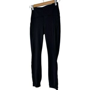 Lululemon Wunder Under High-Rise Tight in black, size 4, is a classic athletic piece perfect for activewear. These 23" leggings feature a flocked design and are designed for gym, yoga, and running. The elastic waist and compression fit offer comfort and support during workouts, making them a lightweight and easy-care option for athletic activities.