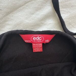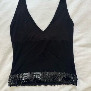 Stylish black halter bodysuit. Features shimmering sequin trim. Perfect for evening wear.