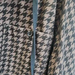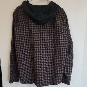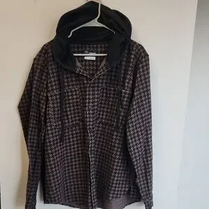 Casual men's jacket with a houndstooth pattern. Features a comfortable hood. Ideal for layering.