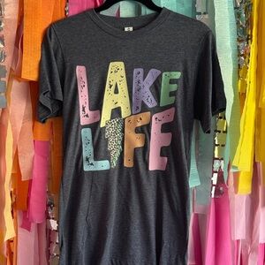 Charcoal short sleeve tee. 'Lake Life' graphic in pastel colors. Soft and comfortable fabric.
