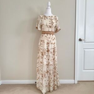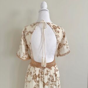 Cream maxi dress with delicate light brown floral embroidery throughout, giving it a soft cottagecore, vintage-inspired feel. Designed with a high scoop neckline and an open back that ties at the waist. The waist has lace detailing and 3 decorative buttons. Features short, flowy sleeves and a gently flowing skirt for an airy, romantic silhouette. Not see through. Has only been worn once. Tagged size XS from Zara, I would say a a 25” waist or lower would be most comfortable in this. Shoot me a message if you have any questions!