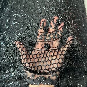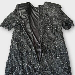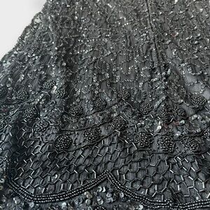 Turn heads in this vintage 1980s Brilliante by J.A. black shift dress, dripping in all-over beading and crafted from luxurious silk. Featuring scalloped edges, a tiered silhouette, and fluttery sheer panels, this dress is a showstopper for cocktail parties, holiday soirées, or vintage collectors. Professionally dry cleaned and in excellent condition, it’s ready to dazzle.